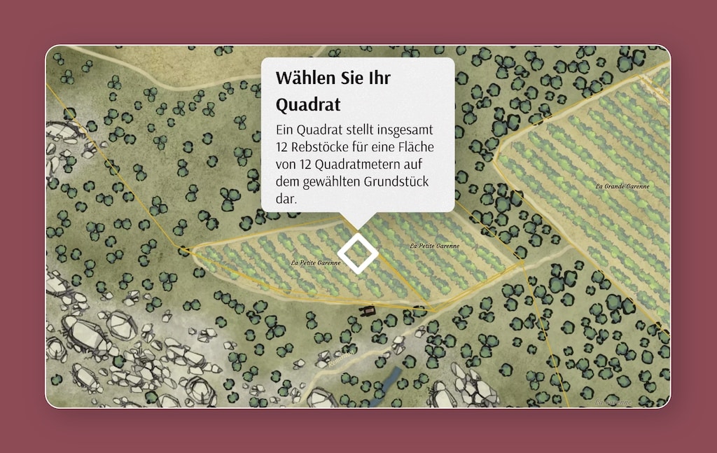 Das Weingut wird Ihnen mehrere Parzellen vorstellen, mit allen Informationen, die Sie benötigen, um Ihre Wahl zu erhellen: Rebsorte, Terroir, Höhe, Bodenart usw. Sobald Sie sich für eine Parzelle entschieden haben, können Sie diese auswählen.